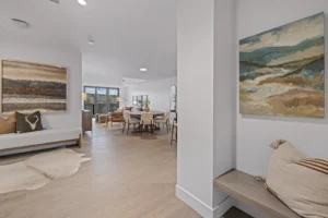 The Project is under development and is not yet complete. The Residence is currently designed to include accessible features such as wider turning radius in closets, storage areas and laundry room, roll-in/transfer shower in the secondary bath, and lower kitchen island sink height. All floor plans, specifications, furnishings, finishes, equipment, trim, features, amenities, and any other characteristics shown here or in any renderings, illustrations, photos, designs, or other visual depictions are illustrative only and may be changed without notice. Statements of approximate square footages are subject to change. Square footage calculations may be made in a variety of manners, and square footage statements cannot be relied upon in deciding to purchase property in the Project or in establishing a purchase price.